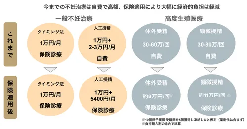 2022年4月より不妊治療に対して保険が適用されるようになりました。特に人工授精や、これまで自費で高額であったARTに関して、患者様の自己負担額は大きく軽減されました。