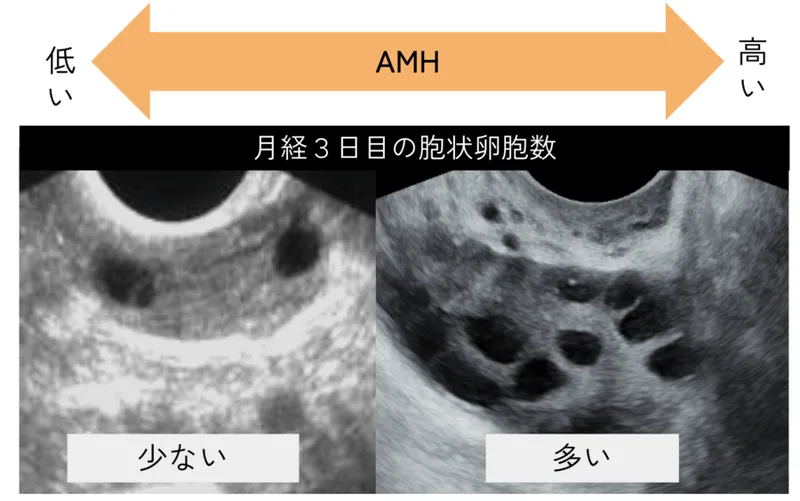 - 臨床の現場においては、残存する卵子の数や治療に反応する卵胞の数を評価する指標として利用されます。年齢とともに減少するため卵巣年齢とも言われますが、これは適切な表現ではなく、卵子の数を反映し質の良し悪しを表すものではありません。